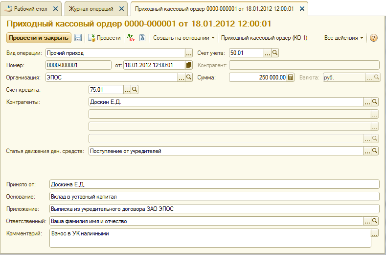 Оформить приходный кассовый ордер № 01 от 18.01.2012 на получение от учредителя Доскина Е.Д. вклада в уставный капитал в сумме 250 000.00 руб.