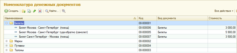 На этих счетах аналитический учет ведется в разрезе «Денежных документов», перечень которых хранится в одноименном справочнике. Справочник является иерархическим, что предполагает возможность объединять однотипные элементы в различные группы, например, в соответствии с видами документов можно ввести группы:
