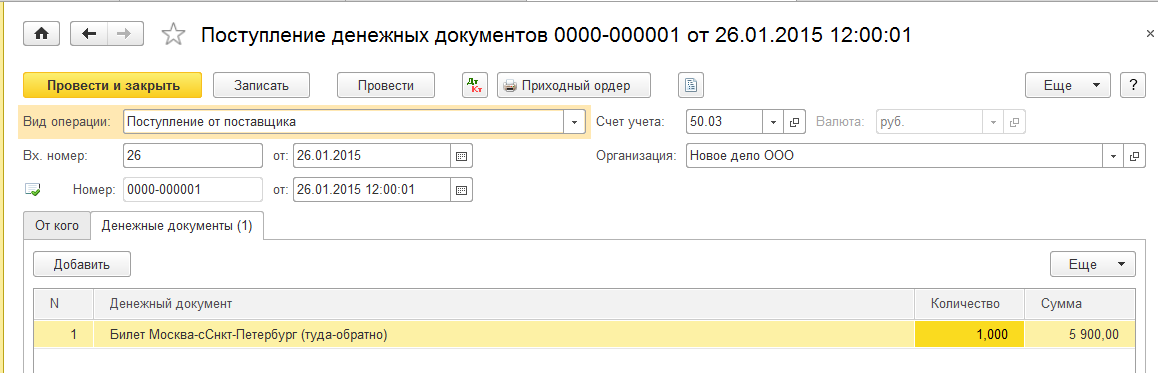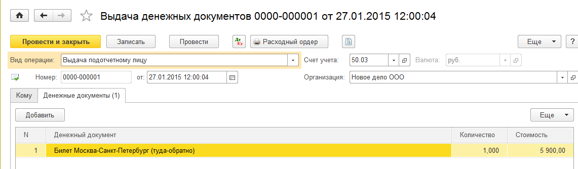 На закладке «Денежные документы» указывается сам билет, количество и стоимость.