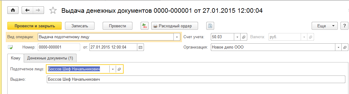 Документ «Выдача денежных документов» отражает проводки по Кт 50.03 в Дт того счета, кому передаем денежный документ. Аналогично документу «Поступление денежных документов» документ «Выдача денежных документов» имеет следующие виды операций: