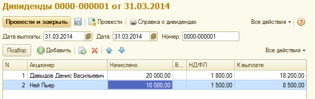 П.Нею и Д.Давыдову начислены дивиденды – 10 000 и 20 000 руб. соответственно. Зарегистрируем данные доходы с помощью документа "Дивиденды" на 31.03.2014.