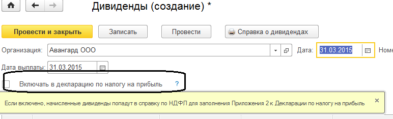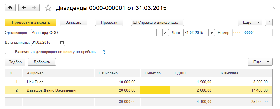 В ООО «Авангард» Нею П. и Давыдову Д.В. начислены дивиденды – 10 000 и 20 000 руб. соответственно. Зарегистрируем данные доходы с помощью документа "Дивиденды" на 31.03.2015, создав его из раздела «Выплаты/ Незарплатные доходы».