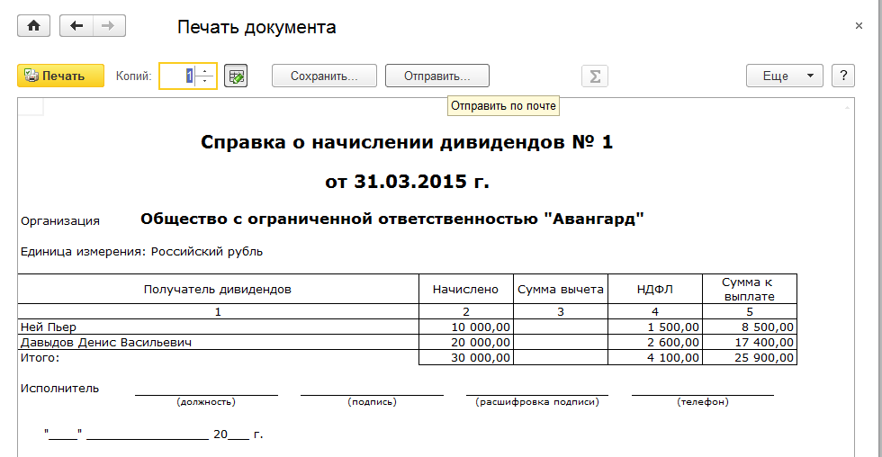 Проведем документ. Выведем на печать справку о дивидендах.