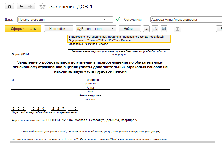 В первом случае заявление достаточно принять, проверить и отправить в отделение ПФР. Во втором случае сотрудник отдела кадров может составить печатную форму заявления с помощью отчета "Заявление ДСВ-1". Отчет доступен в разделе " Налоги и взносы / Отчеты по налогам и взносам".