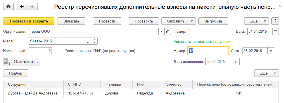 Проведение документа означает, что данные переданы в отделение ПФР. Пачку можно передать в архив, установив соответствующий флажок.