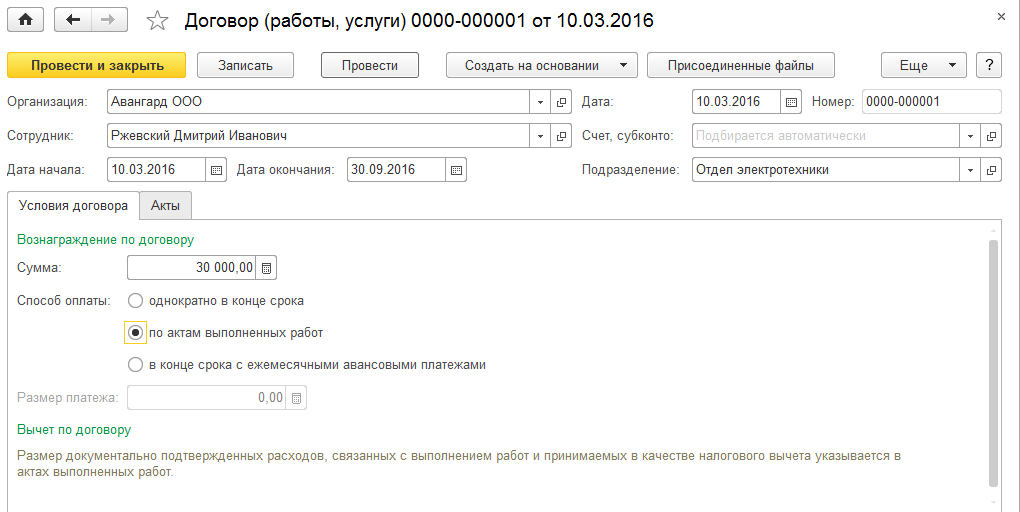 Если в договоре подряда либо авторском договоре указана оплата по актам, то перед расчетом заработной платы в том месяце, в котором следует произвести оплату сотруднику, следует ввести "Акт приемки выполненных работ ".