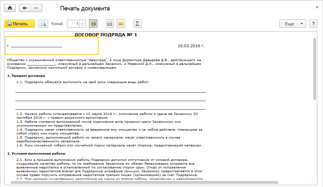 Проведем документ. Выведем на печать договор подряда.