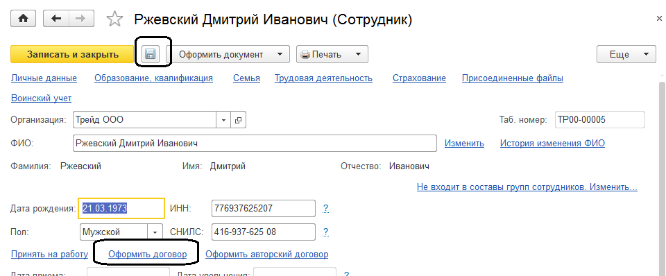 Проведем документ. Обратите внимание, что у сотрудника, с которым заключен только договор подряда, не указывается подразделение и должность в справочнике сотрудники, поскольку это условия трудового договора.