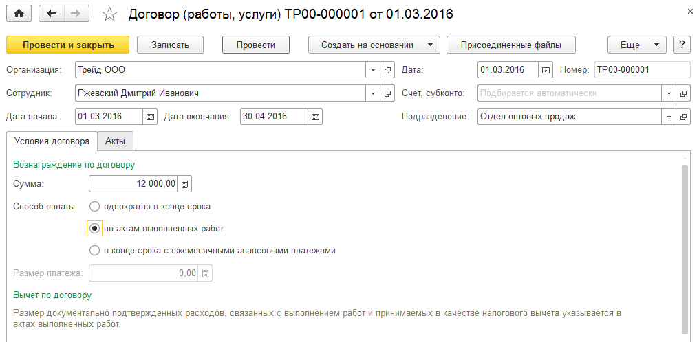 Условия договора: с 01.03.16 по 30.04.16, сумма по договору 12 000 руб., оплата производится по актам выполненных работ. Подразделение затрат - Отдел оптовых продаж.