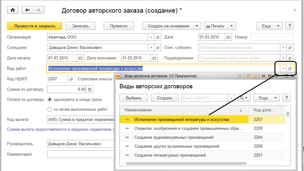 Если в договоре подряда либо авторском договоре указана оплата по актам, то перед расчетом заработной платы в том месяце, в котором следует произвести оплату сотруднику, следует ввести "Акт приемки выполненных работ ".