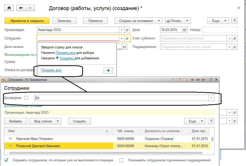 Проведем документ. Обратите внимание, что у сотрудника, с которым заключен только договор подряда, не указывается подразделение и должность в справочнике сотрудники, поскольку это условия трудового договора.