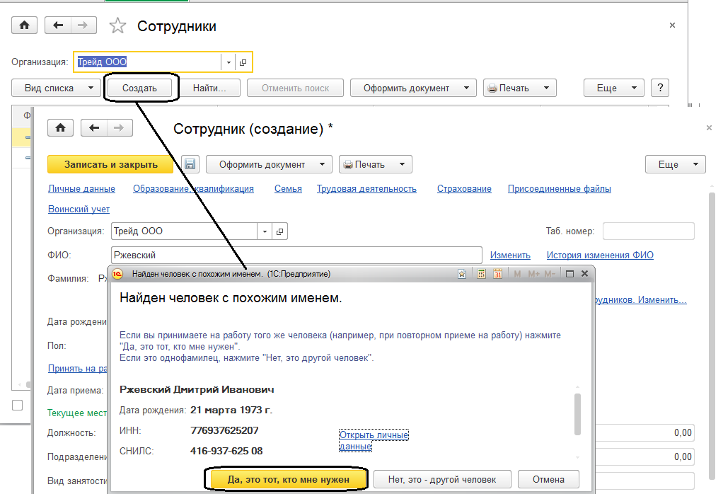 2. Между Ржевским Д.И. и ООО «Трейд» заключен договор подряда сроком на два месяца и оплатой по актам выполненных работ. Т.к. Ржевский Д.И. не работает в ООО «Трейд» по трудовому договору, необходимо, в первую очередь, создать сотрудника в справочнике «Сотрудники», но к имеющемуся физическому лицу.