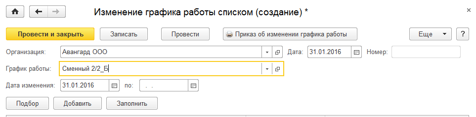 Создадим документ "Изменение графика работы списком" для ООО "Авангард". Для этого в разделе "Зарплата/ Изменение оплаты труда" по команде "Создать/ Изменение графика работы списком" добавим новый документ на 31.01.2016.