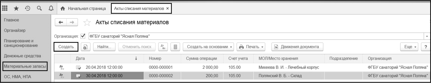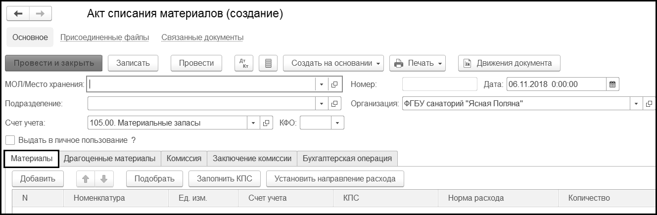 Регистрация документа Акт списания материалов производится в журнале Документы по учету материальных запасов.