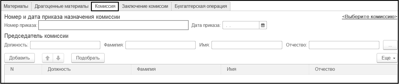 Информация о должности, фамилии, имени и отчестве каждого члена комиссии вводится в табличную часть закладки.