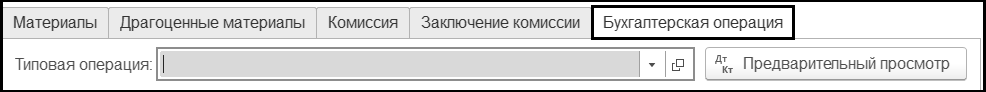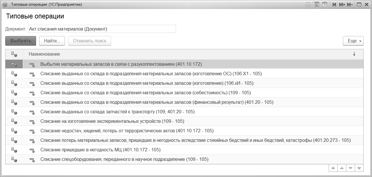 Типовая операция – выбирается из списка Типовые операции. На рисунке показаны типовые операции, предусмотренные для документа Акт списания материалов: