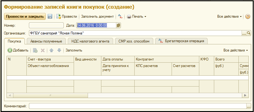 Если все счета-фактуры полученные, введенные в текущем налоговом периоде, уже зарегистрированы в книге покупок и НДС по ним принят к вычету, то документ Формирование записей книги покупок после автозаполнения может оказаться пустым. Это будет означать, что счета-фактуры, для которых требуется регистрация в книге покупок, отсутствуют.