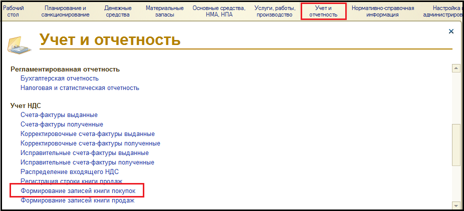 Документ Формирование записей книги покупок используется для регистрации в книге покупок счетов-фактур, выставленных поставщиками, а также иных документов, служащих основанием для принятия НДС к вычету.