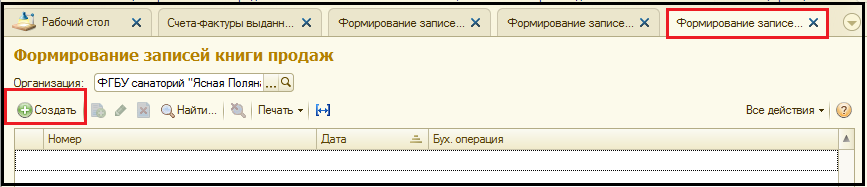Для ввода нового документа можно нажать на кнопку Создать командной панели списка Формирование записей книги продаж.