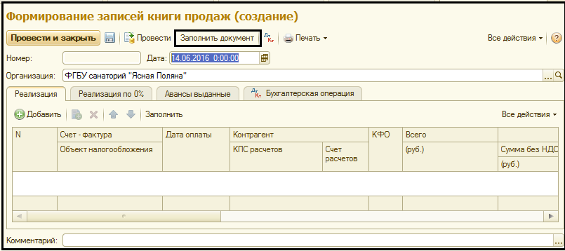 Если все счета-фактуры выданные, введенные в текущем налоговом периоде, уже зарегистрированы в книге продаж и НДС для перечисления в бюджет по ним уже начислен, то документ Формирование записей книги продаж после автозаполнения может оказаться пустым.