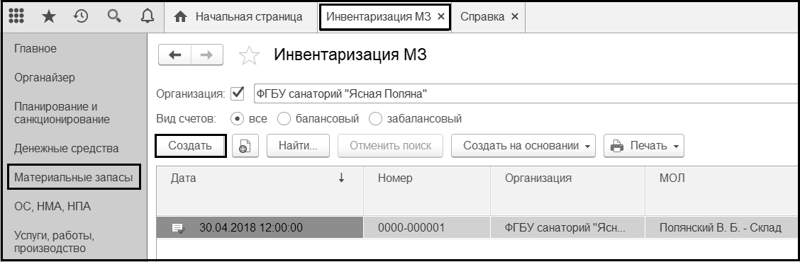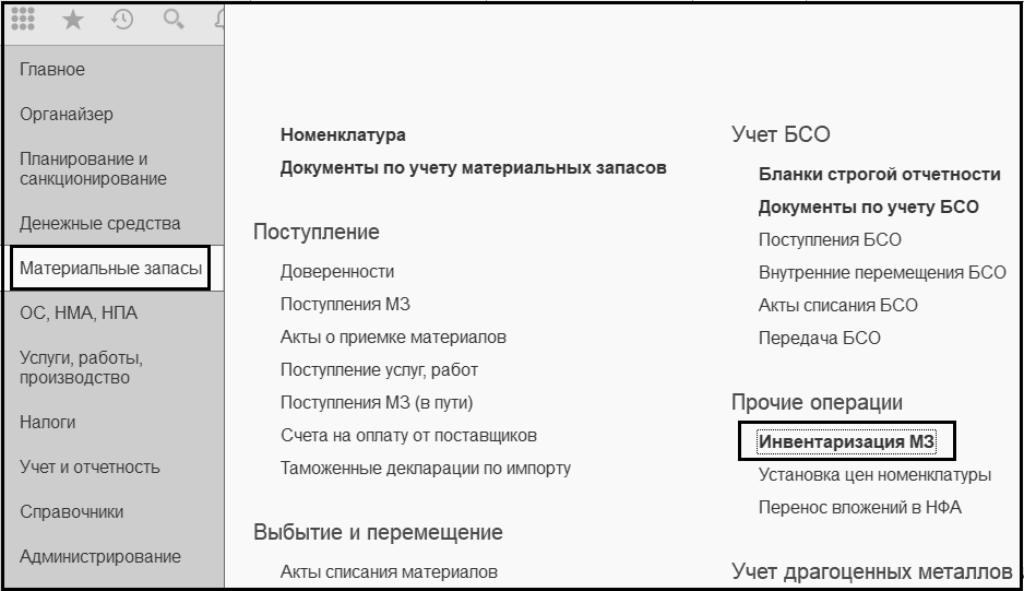 Для проведения инвентаризации материалов следует ввести новый документ Инвентаризация МЗ в разделе Материальные запасы: