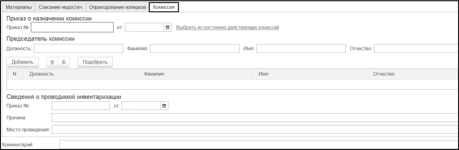На закладке "Комиссия" следует указать номер и дату приказа о создании инвентаризационной комиссии, а также председателя и членов комиссии.