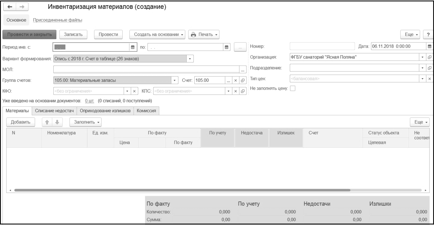 Документ предназначен для отражения результата инвентаризации товарно-материальных ценностей, учет которых ведется как на балансовых, так и забалансовых счетах. Инвентаризация проводится на дату оформления документа.