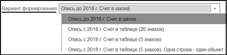Вариант формирования – позволяет выбрать вариант заполнения документа и формирования печатной формы инвентаризационной описи и ведомости расхождений по результатам инвентаризации.