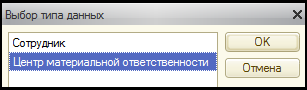 Тип данных, Сотрудник или Центр материальной ответственности, следует выбрать в форме Выбор типа данных: