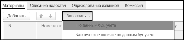 Для заполнения табличной части на закладке Материалы рекомендуется использовать возможность автозаполнения по данным учета. Автозаполнение происходит после нажатия на кнопку Заполнить командной панели табличной части этой закладки и выбора в меню пункта По данным бух. учета.