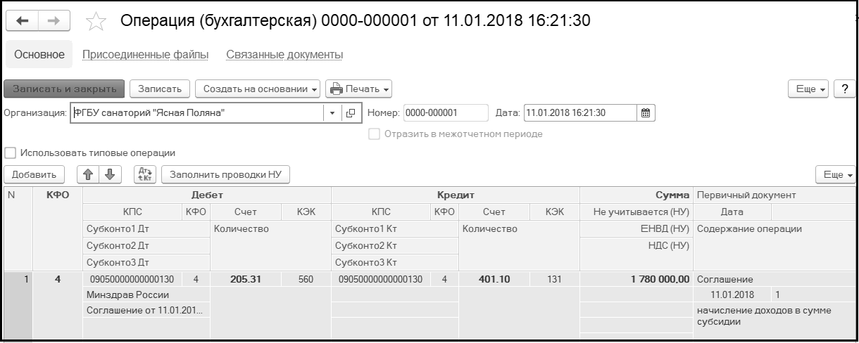 Форма операции в типовой конфигурации содержит общие данные хозяйственной операции и данные всех ее проводок.