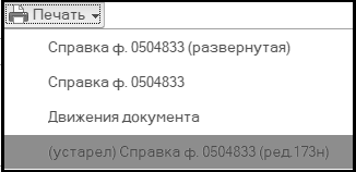 "Печать" формы операции позволяет представить данные операции в виде бухгалтерской справки по ф. № 0504833, которую затем можно вывести на печать.