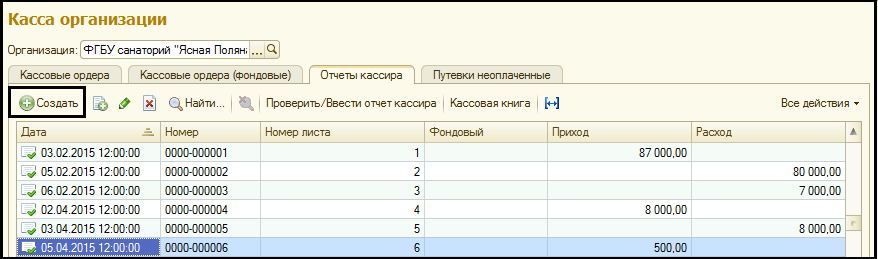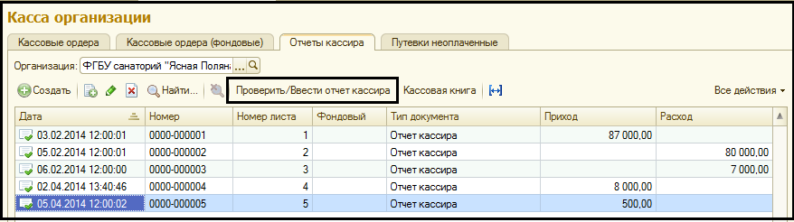 Отметим, что за каждый день можно ввести только один отчет кассира по каждой организации и валюте по денежной кассе и один отчет кассира по каждой организации по фондовой кассе.