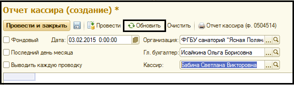 Вводится Дата формирования отчета, затем кнопкой Обновить на верхней командной панели, формируется отчет кассира за указанную дату.