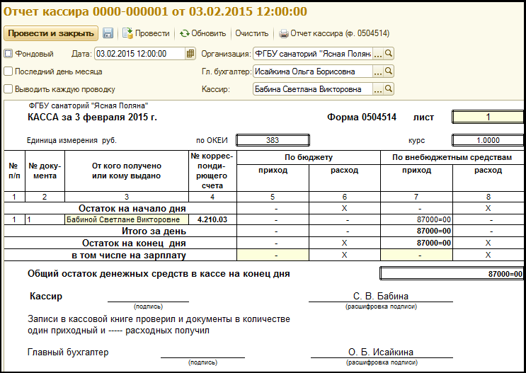 в том числе на зарплату данными об остатках денежных средств на заработную плату на конец дня. При заполнении отчета кассира остатки по заработной плате автоматически переносятся из предыдущего отчета кассира.