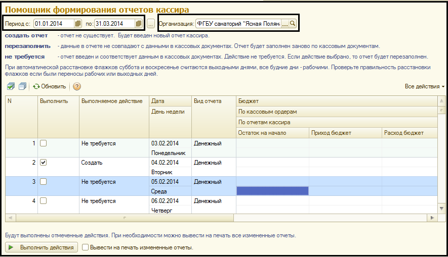 Для формирования отчетов кассира нажмите на кнопку "Выполнить действия" (команда в нижней части формы). После этого все отмеченные отчеты кассира будут созданы или перезаполнены в соответствии с настройками. Если в графе "Выполняемое действие" присутствует значение "Не требуется" и установлен флаг "Выполнить", то отчет кассира будет перезаполнен. При перезаполнении отчетов кассира пересчитывается количество листов и может измениться их нумерация. Поэтому при добавлении или перезаполнении отчетов кассира рекомендуется поставить флаг "Выполнить" у всех отчетов кассира, начиная от отмеченного и заканчивая последним.