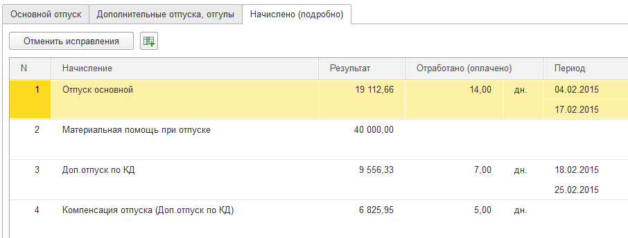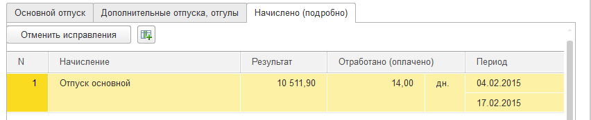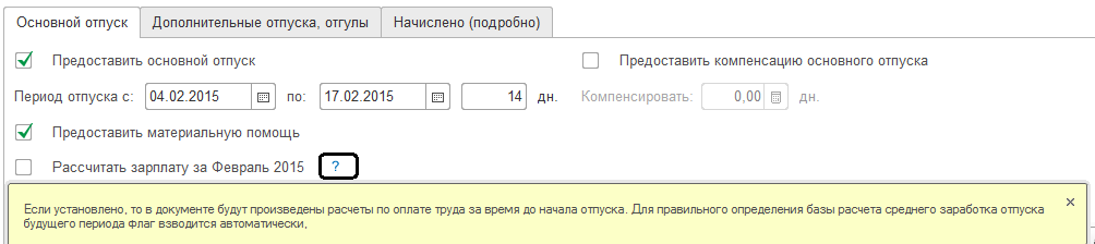 На закладке "Основной отпуск" определяется, что будет начислено сотруднику: