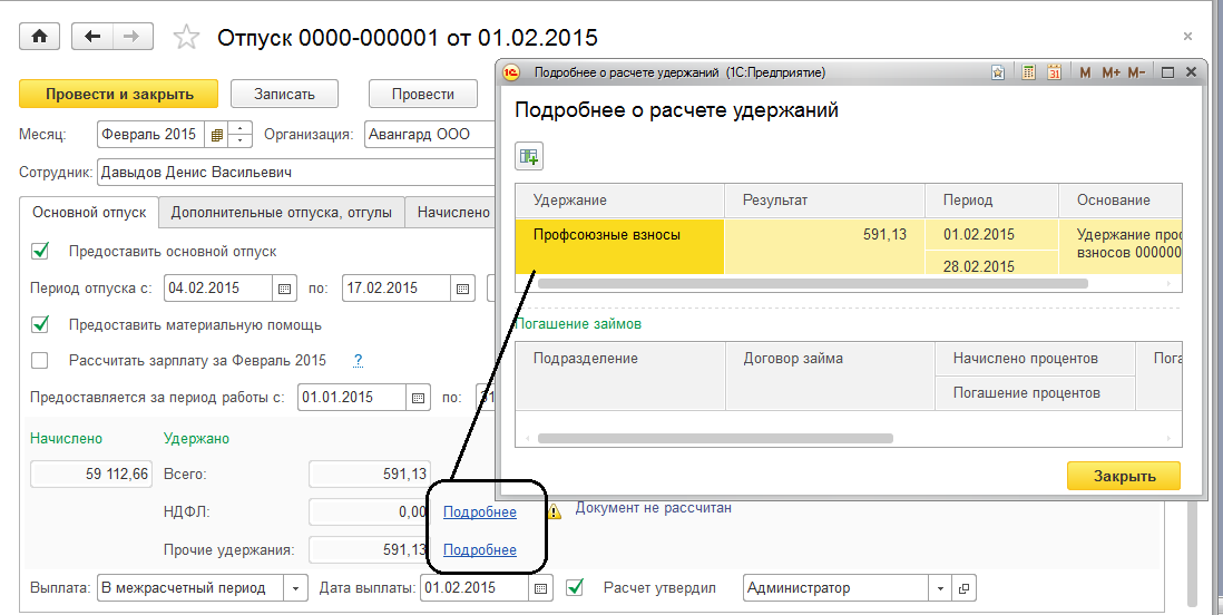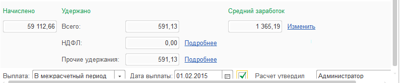 НДФЛ и прочие удержания рассчитываются предварительно, информация о расчете может быть получена по ссылке "Подробнее". Данные сведения используются только при выплате в межрасчетный период, при выплате с зарплатой или авансом НДФЛ и прочие удержания не отображаются.