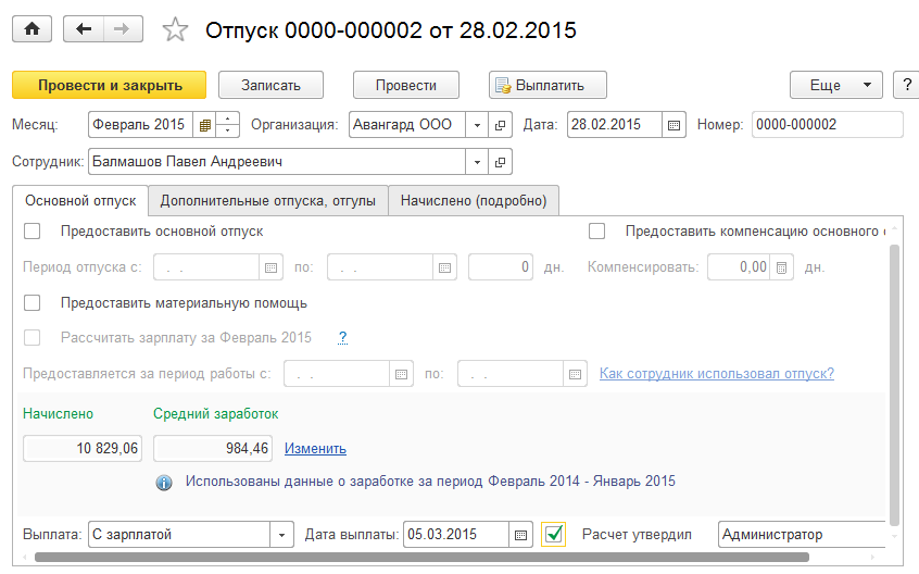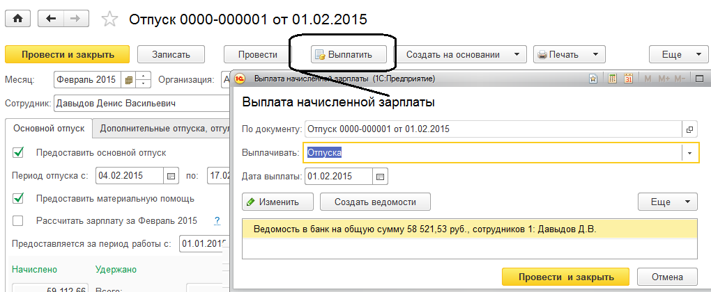 1. Выплатим рассчитанные отпускные сотруднику ООО «Авангард» Давыдову Д.В. 01.02.15. Для этого в «его» документе «Отпуск» нажмем команду «Выплатить»