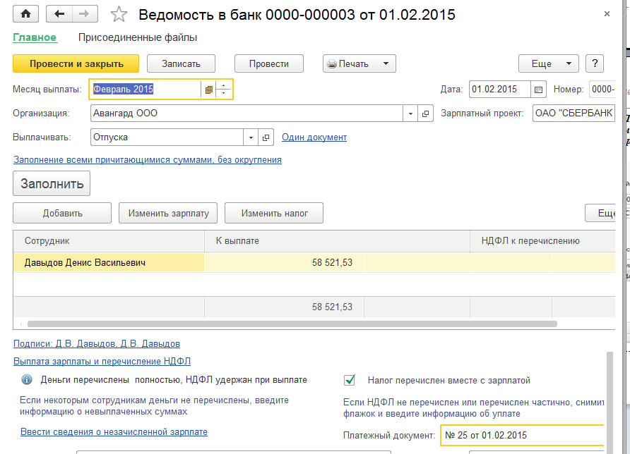 Сотруднику будет предложено сформировать ведомость в банк. По команде «Провести и закрыть» создадим и проведем ведомость. Перейдем к данной ведомости в разделе «Выплаты/ Ведомости в банк», и укажем реквизиты уплаты НДФЛ: № 25 от 01.02.15