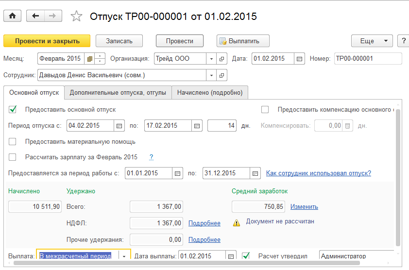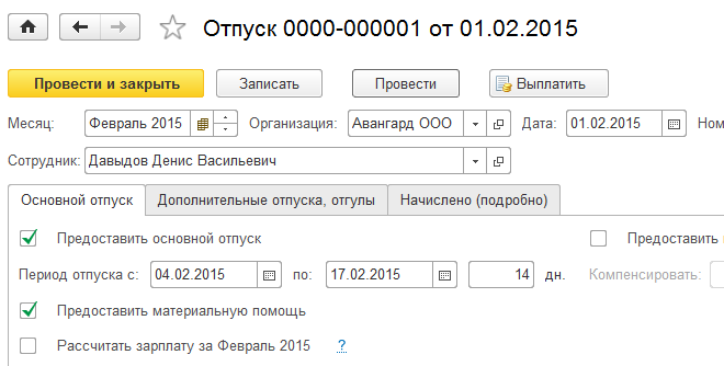 2. Поскольку Давыдов Д.В. работает и в ООО «Трейд», то начислим и выплатим ему также отпуск и по внешнему совместительству аналогичным образом. Создадим документ «Отпуск», сроки основного отпуска – с 04.02 по 17.02. Материальная помощь в ООО «Трейд» не предоставляется. Дата выплаты дохода НДФЛ – 01.02.15.