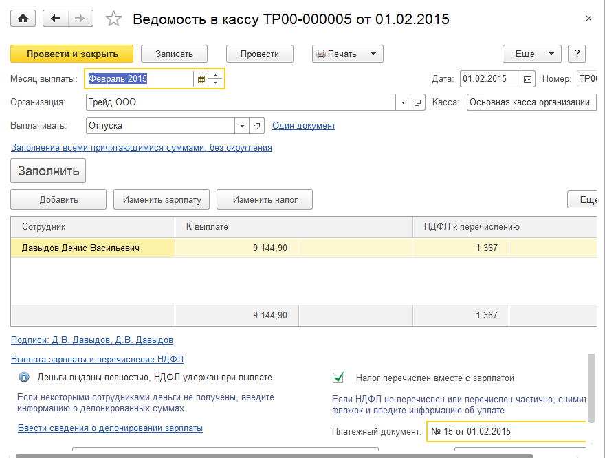 Проведем документ и оформим выплату отпуска через кассу 01.02.2015 (реквизиты уплаты НДФЛ - № 15 от 01.02.2015).
