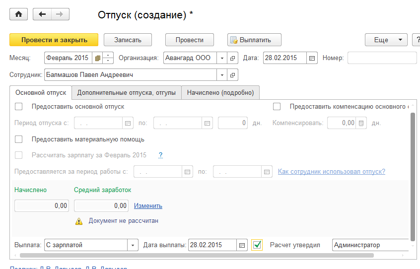 Данным документом на текущий момент также можно регистрировать и неоплачиваемые отпуска, однако для этих целей все же предусмотрен документ «Отпуска без сохранения зарплаты».