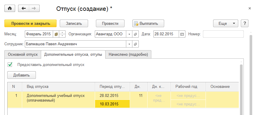3. Предоставим учебный отпуск сотруднику ООО «Авангард» Балмашову П.А., учебный отпуск требуется выплатить вместе с заработной платой за месяц. Для этого создадим новый документ «Отпуска».