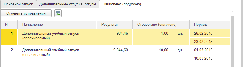 Сроки отпуска с 28.02. по 10.03 Сведения об учебном отпуске заполняются на закладке "Дополнительные отпуска" (дату НДФЛ укажем 28.02.2015)