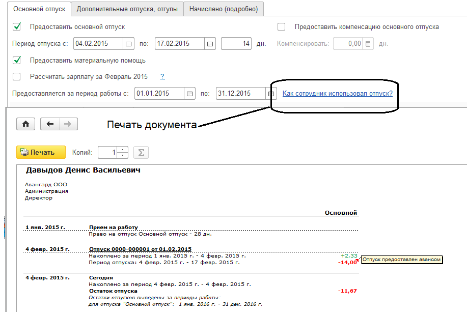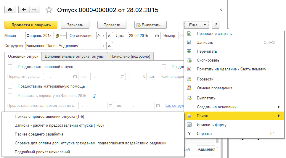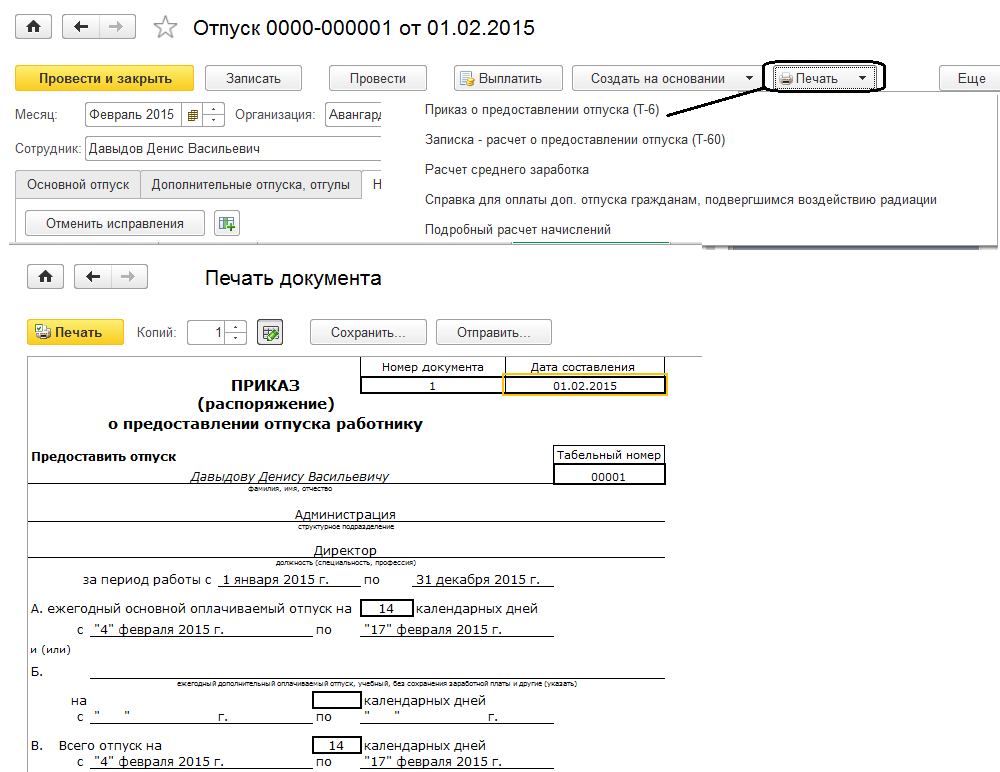 Из формы документа можно распечатать документы, предназначенные для документального подтверждения отпуска.
