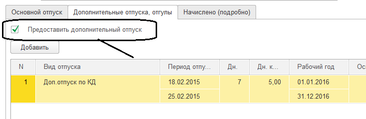 На закладке "Дополнительные отпуска" перечисляются виды дополнительных отпусков к оплате, в том числе учебные и не ежегодные. Здесь же может рассчитываться компенсация дополнительных ежегодных отпусков.
