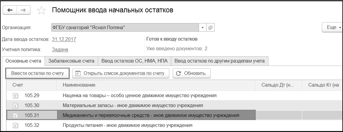 Документ предназначен для ввода данных по остаткам материальных запасов как на балансовых, так и на забалансовых счетах и автоматического формирования проводок в начале эксплуатации программы.