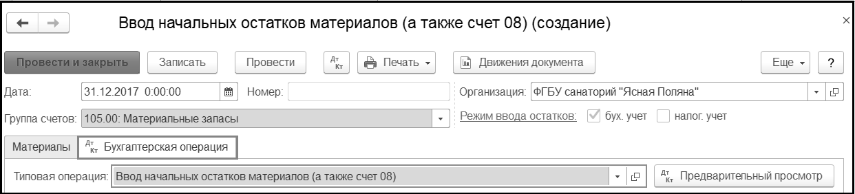 На закладке Бухгалтерская операция указывается Типовая операция – не выбирается, имеет по умолчанию значение "Ввод начальных остатков материалов (а также счет 08)".