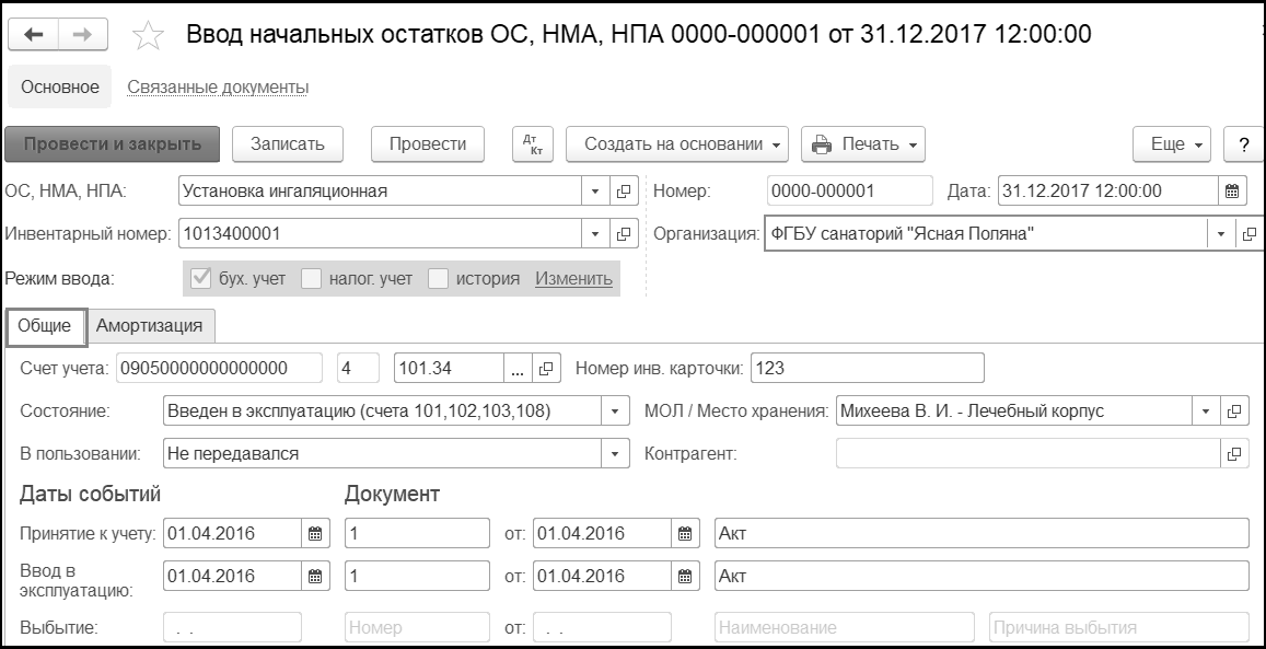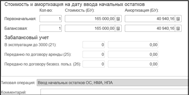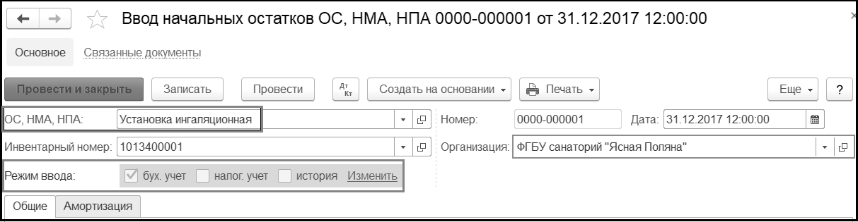 Документ Ввод остатков ОС, НМА, НПА вводится по одному объекту ОС, НМА, НПА, который указывается в шапке документа.